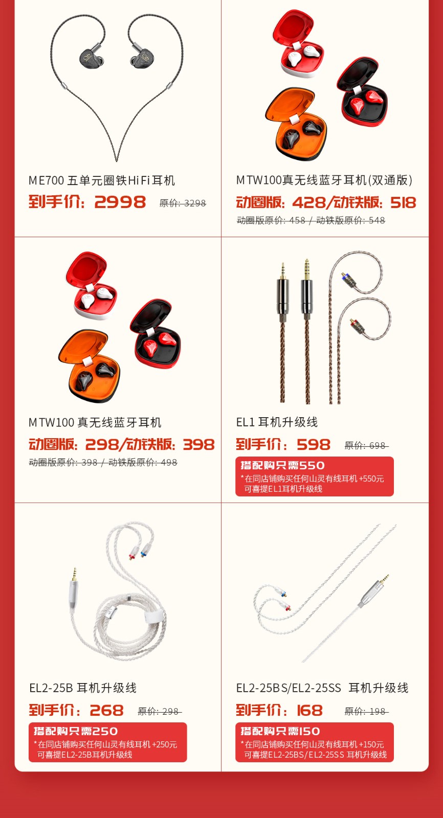山靈耳機升級線家族:EL1到手價僅598元,EL2-25B到手價268元,EL2-25B S/EL2-25SS到手價168元,劃重點:以上升級線搭配山靈任意有線耳機購買有疊加優惠。